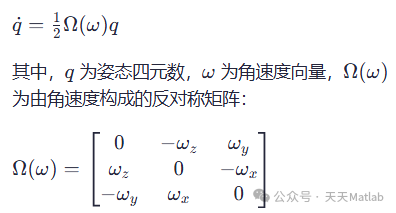 航天器姿态通常采用四元数或欧拉角表示。本文选择四元数表示姿态,因为它能够避免欧拉角的奇异性问题,且在计算上更加简洁高效。基于四元数表示的航天器姿态动力学方程可以表示为: