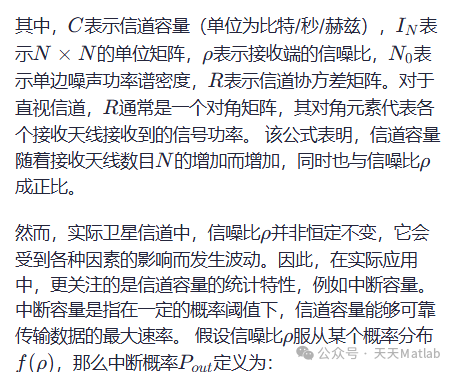 直视信道是指发射信号直接从卫星天线传播到地面接收天线,而没有经历明显的反射或散射。在SIMO系统中,地面接收端配备多个天线接收来自卫星的信号。这种多天线接收技术可以有效利用空间分集增益,提高系统可靠性和信道容量。然而,即使在直视信道下,卫星信道仍然面临着诸如大气衰减、热噪声以及卫星自身器件噪声等挑战。这些因素都会限制系统的信道容量。
