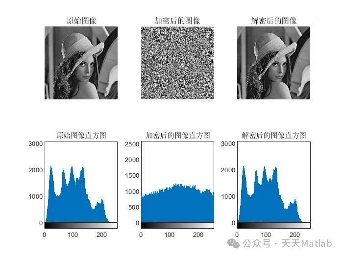 信息熵分析: 计算加密图像的信息熵,以评估其随机性。 结果表明,加密图像的信息熵接近理论最大值,说明加密图像具有良好的随机性。