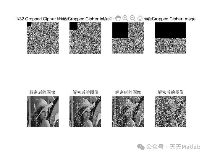 密钥敏感性分析: 通过改变密钥参数微小数值,分析其对加密图像的影响。结果表明,即使密钥参数发生微小变化,加密图像也会发生显著差异,证明了算法对密钥的敏感性。