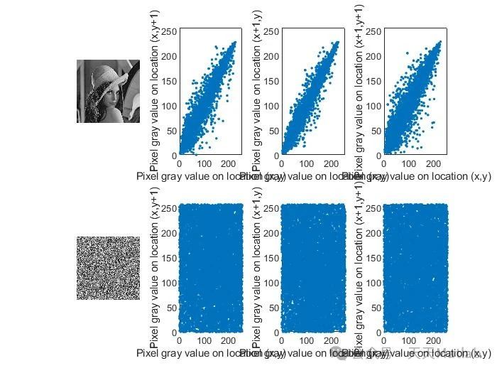 相关性分析: 分析相邻像素之间的相关性,以评估算法的扩散能力。结果表明,加密图像相邻像素之间的相关性非常低,证明了算法的有效扩散能力。
