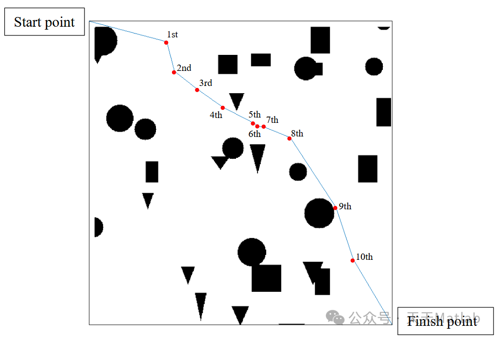适应度函数设计: 适应度函数需要考虑路径长度和避障两个因素。路径长度越短,避障程度越高,适应度值越高。可以采用以下公式: