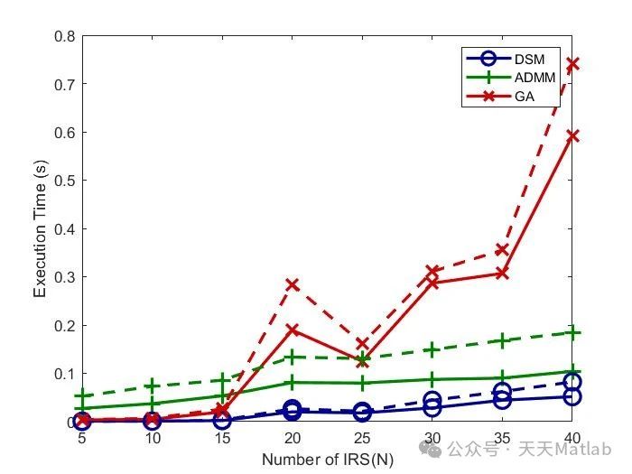为了验证 DSM 算法的有效性,本文进行了大量的数值仿真实验。结果表明,与两种基准方法(例如基于 SDR 的方法和坐标下降法)相比,DSM 算法在获得接近最优和速率的同时,具有更快的收敛速度。这证明了 DSM 算法在低复杂度 IRS 相移优化方面的优越性。