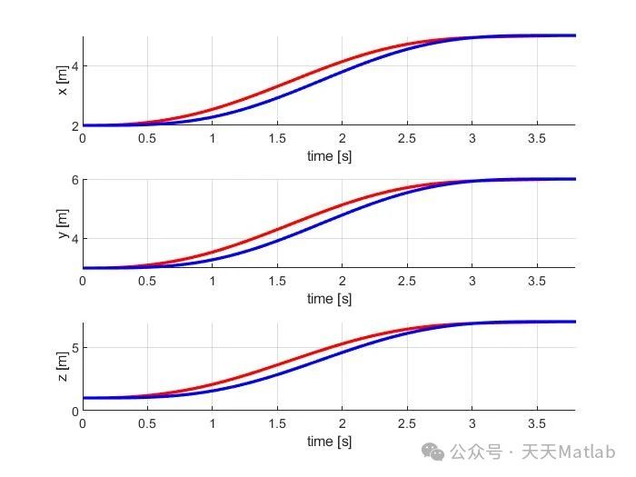 在设定好预定的航线后,我们进行了无人机巡航仿真。仿真结果包括巡航路线图、位移图和速度图。(图5, 图6, 图7)。 为了更全面地评估控制算法的性能,我们分别模拟了理想情况(忽略重力和干扰)和实际情况(考虑重力和正态分布的干扰噪声)。 图中蓝线代表理想情况下的无人机飞行轨迹和参数变化,红线则代表考虑重力和噪声干扰后的实际飞行情况。 对比两条曲线,可以清晰地观察到干扰对无人机飞行轨迹的影响,以及PD控制算法在抑制干扰方面的效果。 例如,在存在干扰的情况下,无人机的轨迹可能会出现轻微的偏差,但通过PD控制器的作用,偏差被有效地抑制在可接受的范围内。