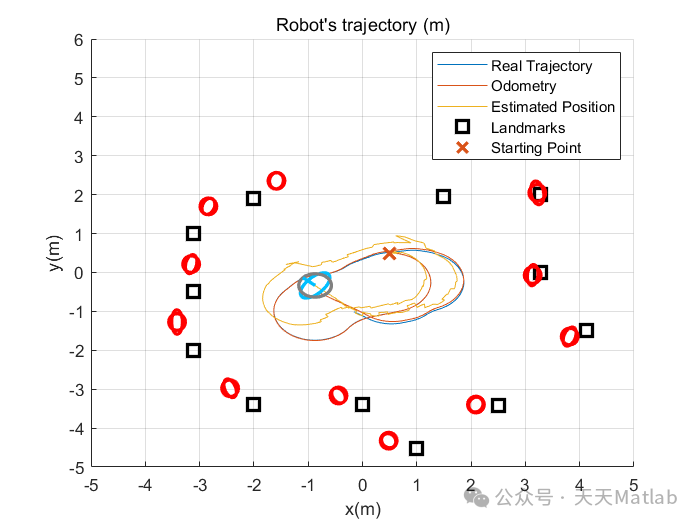 本文研究了基于EKF的SLAM算法在模拟环境中的收敛性和一致性。通过对系统模型的详细描述和对算法的收敛性分析,我们证明了在特定条件下,该算法能够收敛到真实状态的邻域。仿真结果进一步验证了算法的有效性。未来的工作将集中在提高算法的鲁棒性和处理更复杂环境的能力上,例如考虑更复杂的运动模型和传感器模型,以及研究更先进的SLAM算法。