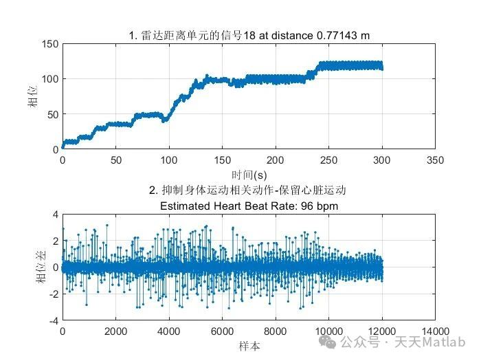 相位估计: 通过对接收信号进行相位估计,可以得到包含心跳和呼吸相关信息的信号。 相位信息的提取依赖于对FMCW雷达信号的精细处理,需要考虑多径效应和噪声的影响。
