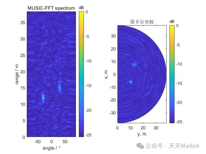 MUSIC和MVDR算法都是有效的雷达信号处理方法,但它们也存在一些差异。MUSIC算法具有更高的分辨率,能够分辨更接近的目标,但其计算复杂度较高,对快拍数的要求也较高。MVDR算法的计算复杂度相对较低,对快拍数的要求也较低,但其分辨率不如MUSIC算法。在实际应用中,需要根据具体的应用场景选择合适的算法。