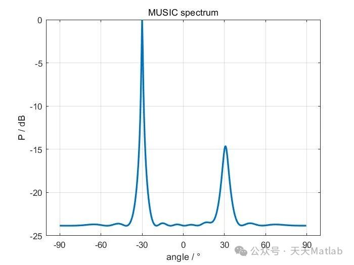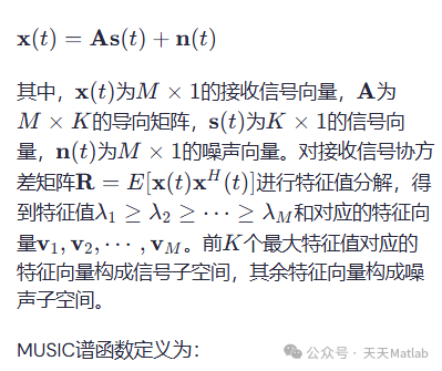 MUSIC算法是一种基于子空间分解的高分辨率谱估计方法。其核心思想是将接收到的信号协方差矩阵进行特征值分解,将特征向量空间分解为信号子空间和噪声子空间。信号子空间由信号向量张成,而噪声子空间则正交于信号子空间。MUSIC算法利用噪声子空间的正交性来构建谱函数,通过搜索谱函数的峰值来估计信号源的方向。