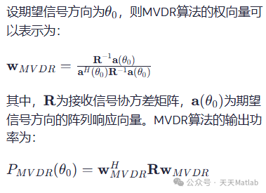 MVDR算法是一种基于最小方差准则的自适应波束形成算法。其目标是设计一个权向量,使得在保证对期望信号无失真响应的同时,最小化输出噪声功率。