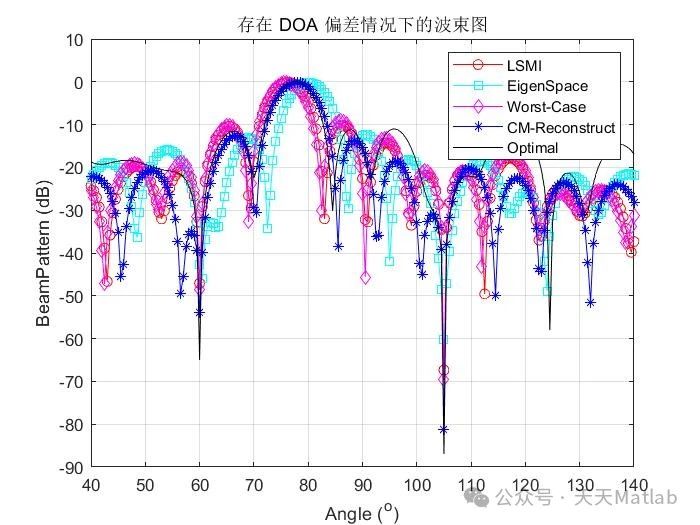总结而言,在 DOA 误差存在的情况下,基于协方差矩阵重构方法的波束形成能够有效地提高波束形成器的性能。通过对协方差矩阵进行修正或估计,可以减轻 DOA 误差的影响,提高期望信号的输出信噪比,并抑制干扰和噪声。未来的研究方向可以集中在提高协方差矩阵估计的精度、降低算法的计算复杂度、以及开发更鲁棒的协方差矩阵重构方法等方面,以进一步提升波束形成技术在各种复杂环境下的应用性能。 选择合适的重构方法需要综合考虑计算复杂度、鲁棒性和重构精度等因素,并根据具体的应用场景进行优化。 深入研究不同方法的优缺点及其适用条件,对于推动波束形成技术的发展具有重要意义。