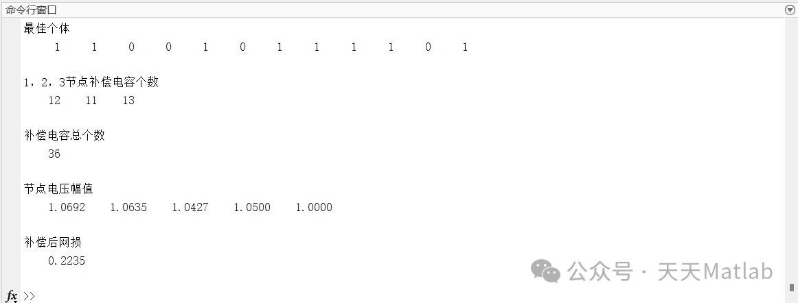 潮流计算: 将每个染色体代表的投切方案应用于5节点系统,进行潮流计算,得到节点电压和网损等信息。