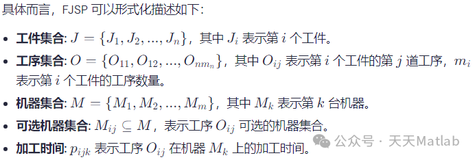 柔性车间调度问题 (FJSP) 可以描述为:给定 𝑛n 个工件,每个工件包含若干道工序,每道工序可以在多个可选机器上进行加工。FJSP 的目标是确定每个工件的加工顺序和每道工序的加工机器,使得一个或多个性能指标达到最优。