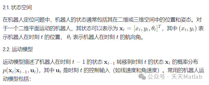 运动模型通常包含噪声,这是由于控制指令的执行误差、轮子打滑等因素引起的。在粒子过滤器中,运动模型用于根据前一时刻的粒子状态和控制输入,预测当前时刻每个粒子的新状态。
