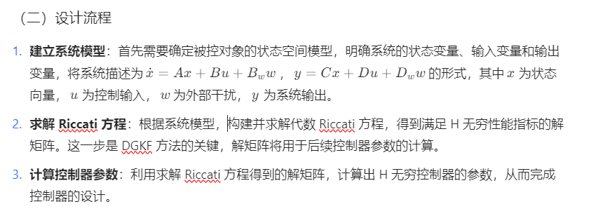 DGKF 方法基于状态空间理论,其核心思想是通过求解代数 Riccati 方程,找到使系统 H 无穷范数最小化的控制器参数。该方法利用系统的状态空间模型,将 H 无穷控制问题转化为求解特定的矩阵方程,从而得到满足性能要求的控制器。