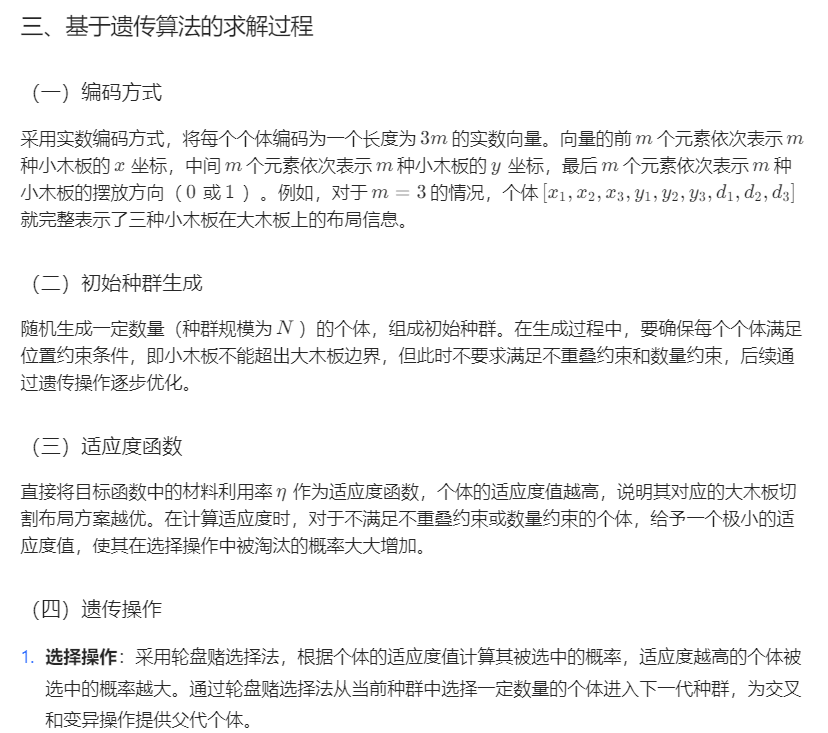 遗传算法由美国密歇根大学的约翰・霍兰德(John Holland)于 20 世纪 70 年代提出,它借鉴生物进化过程中的 “适者生存” 原则,通过选择、交叉和变异等遗传操作,对问题的潜在解进行迭代优化,逐步逼近最优解。遗传算法具有全局搜索能力强、对问题依赖性小、易于与其他算法结合等优点,适用于求解复杂的组合优化问题,大木板切割布局优化正是这类问题的典型代表。