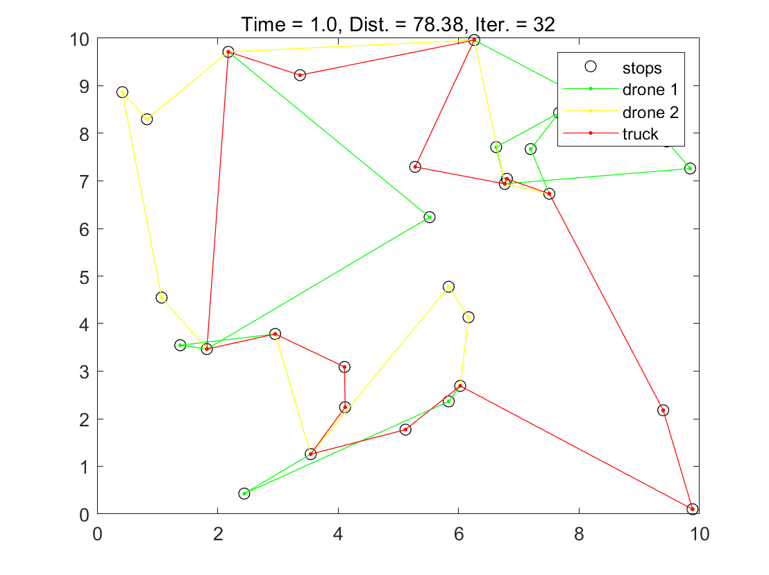 假设存在一个中转站,一辆卡车和两架无人机需将小包裹递送给随机分布的