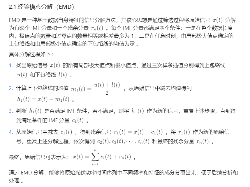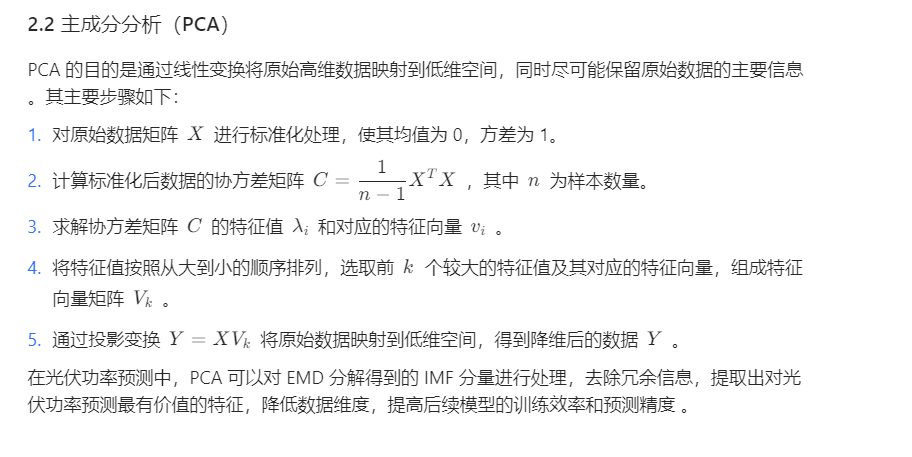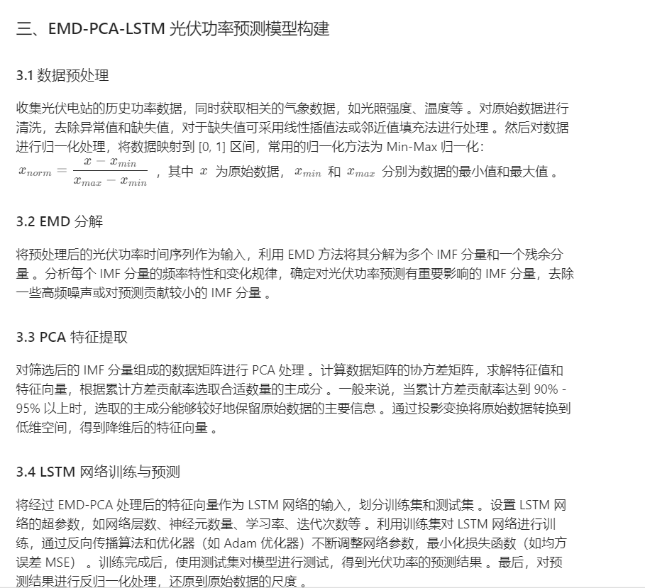 经验模态分解(EMD)是一种自适应的信号处理方法,能够将复杂的非线性、非平稳信号分解为多个固有模态函数(IMF),揭示信号的内在特征 。主成分分析(PCA)是一种常用的降维技术,通过对数据进行正交变换,将原始数据转换为一组互不相关的主成分,在保留数据主要信息的同时降低数据维度 。本研究将 EMD、PCA 与 LSTM 相结合,构建 EMD-PCA-LSTM 光伏功率预测模型,旨在提高光伏功率预测的准确性和可靠性。