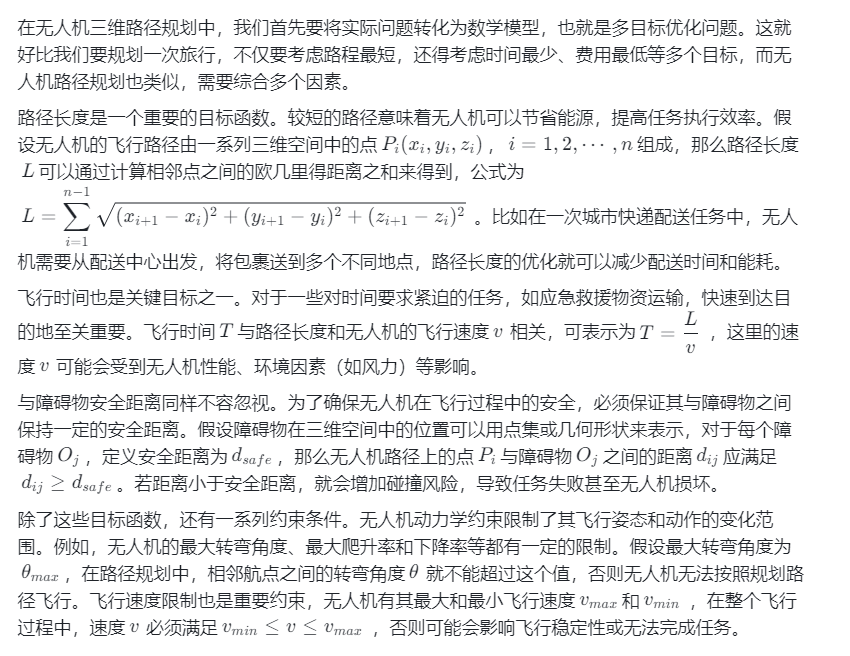 在无人机三维路径规划中,我们首先要将实际问题转化为数学模型,也就是多目标优化问题。这就好比我们要规划一次旅行,不仅要考虑路程最短,还得考虑时间最少、费用最低等多个目标,而无人机路径规划也类似,需要综合多个因素。