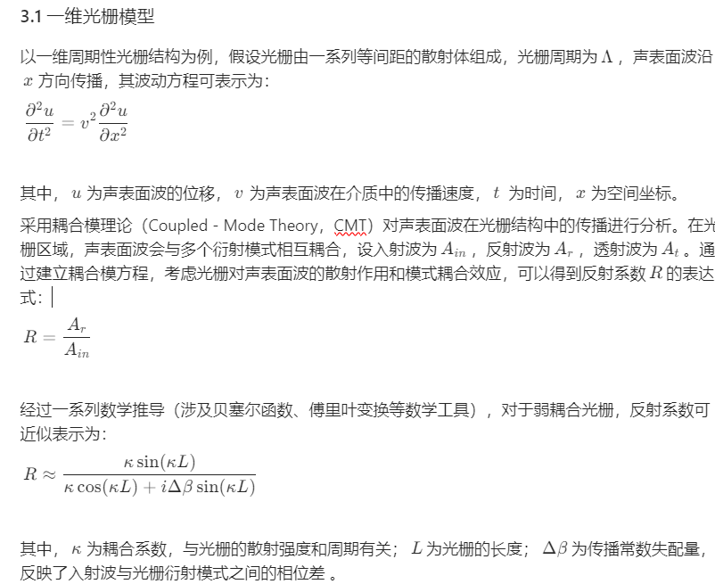 在现代声学与传感器技术领域,声表面波(Surface Acoustic Wave,SAW)器件凭借其体积小、灵敏度高、功耗低等优势,广泛应用于通信、传感、滤波等多个领域。光栅结构作为一种常见的声表面波调控元件,能够通过对声表面波的反射、透射和衍射等作用,实现对声表面波传播特性的精确控制。而反射系数作为描述声表面波在光栅结构中反射特性的关键参数,深入研究其变化规律和影响因素,对于优化声表面波器件性能、拓展其应用范围具有重要意义 。例如,在声表面波滤波器设计中,精确掌握反射系数有助于提高滤波器的选频特性和带外抑制能力;在声表面波传感器中,反射系数的变化可用于检测外界物理量的微小变化。