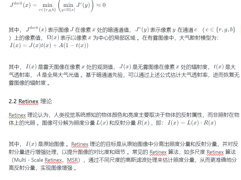 图像去雾技术经过多年发展,已涌现出众多方法 。传统方法中,基于物理模型的去雾算法通过建立大气散射模型,估计模型参数来恢复清晰图像 。其中,暗通道先验算法(Dark Channel Prior,DCP)凭借其简单有效、计算效率高的特点,成为经典方法之一 ,它通过观察发现无雾图像的暗通道像素值趋近于零,进而估计大气透射率实现去雾 。然而,该方法在处理天空区域和亮度较高区域时容易出现过饱和、颜色失真等问题 。基于 Retinex 理论的图像增强方法则从人类视觉系统对光照和反射的感知出发,通过分离图像的照度分量和反射分量,增强图像的对比度和细节 ,但单独使用 Retinex 理论无法去除图像中的雾气 。近年来,一些深度学习方法也被应用于图像去雾领域 ,如基于卷积神经网络(CNN)的端到端去雾模型,通过大量数据训练学习雾图和清晰图之间的映射关系 ,但这类方法往往需要大量标注数据,计算复杂度高,且泛化能力有待提高 。将暗通道先验和 Retinex 理论相结合的方法,有望弥补单一方法的不足,实现更优的图像去雾增强效果 。