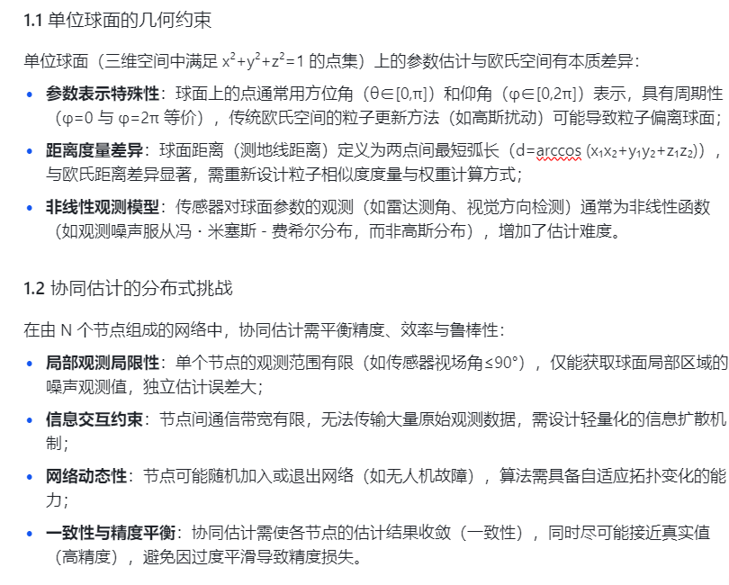 在传感器网络、无人机编队、天文观测等领域,常需对单位球面上的参数(如目标方向、姿态角、天体位置)进行协同估计。单位球面的几何特性(如周期性、非欧氏距离度量)使参数估计面临独特挑战,而单一节点的观测噪声、观测范围有限等问题进一步增加了估计难度。扩散粒子滤波器(Diffusion Particle Filter, DPF)网络通过分布式节点的信息交互与协同处理,能在保持各节点自主性的同时提升估计精度,成为解决单位球面协同参数估计的有效方案。本文构建适用于单位球面的扩散粒子滤波器网络模型,设计协同估计策略,并通过实验验证其性能优势。