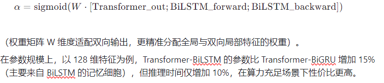- 双向特征融合增强:BiLSTM 的前向 LSTM 与反向 LSTM 输出通过拼接而非简单相加,保留更丰富的双向时序细节,融合层自适应系数 α 的计算纳入双向特征差异: