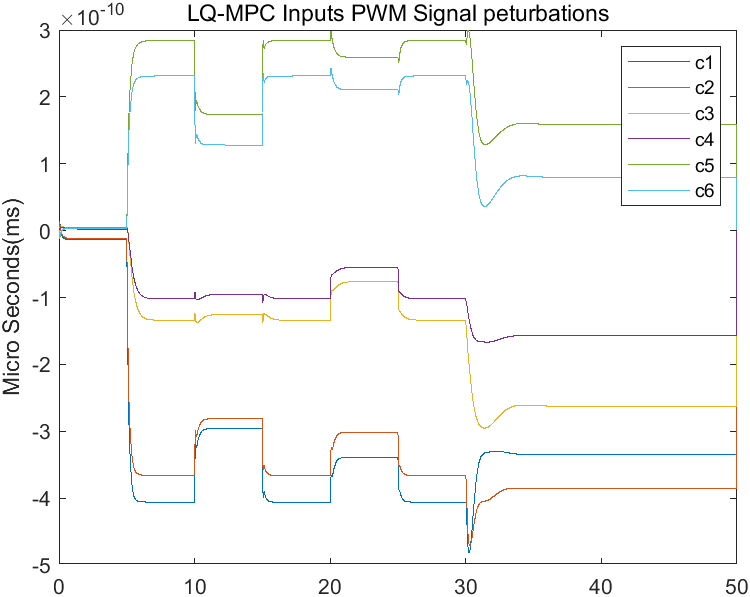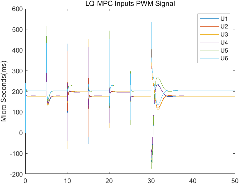 仿真与性能分析对比 LQR,LQ-MPC 考虑输入约束(如电机 PWM 信号范围),在跟踪参考轨迹(高度、姿态阶跃指令)时,通过滚动优化实时调整控制输入,绘制实际输出、估计误差、控制输入及成本函数曲线,验证其在约束条件下的优越性。