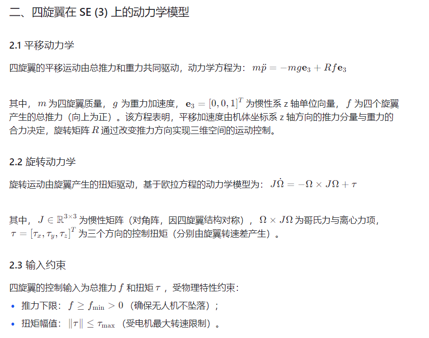 在无人机控制领域,传统基于局部坐标(如欧拉角)的控制方法常因奇点问题(如俯仰角 90° 时的万向锁)和坐标转换误差,导致高动态飞行场景下的性能退化。基于特殊欧氏群 SE (3) 的几何跟踪控制方法,直接在刚体运动的全局配置空间中设计控制器,从根本上避免了局部坐标带来的缺陷,成为高精度、高稳定性无人机控制的主流方案。本文系统阐述 SE (3) 几何跟踪控制的理论基础、设计方法与工程实现,为四旋翼无人机的精准轨迹跟踪提供完整解决方案。