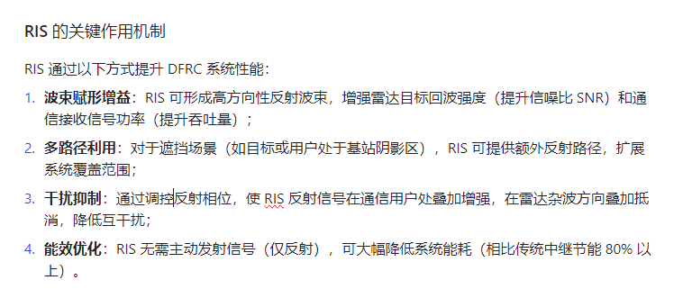 智能超表面(RIS)作为重构无线传播环境的革命性技术,通过调控大量低成本无源反射单元,可灵活改变电磁波的振幅、相位和极化特性,为解决雷达与通信系统的频谱资源冲突、能效瓶颈提供了全新思路。双功能雷达和通信系统(DFRC)旨在共享硬件平台与频谱资源,同时实现目标探测与信息传输,但传统架构面临雷达探测精度与通信速率难以兼顾的挑战。本文提出 RIS 辅助的 DFRC 波束形成设计方案,通过 RIS 的反射调控增强雷达回波信噪比与通信链路质量,构建 “发射端主动波束 + RIS 被动反射波束” 的协同优化框架,实现雷达与通信性能的联合提升。