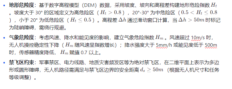 复杂山地环境的路径规划需先建立精确的危险模型,量化地形、气象、障碍物等风险因素,为路径优化提供约束依据。