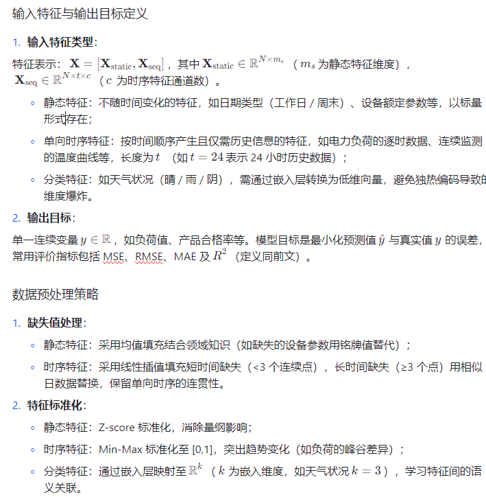 多输入单输出回归任务需从静态、时序等多类型特征中学习映射关系,输出单一连续变量。以实时电力负荷预测为例,输入包括历史负荷曲线(时序)、气象数据(温度、湿度等,部分为时序)、日期类型(静态分类特征),输出为未来 1 小时的负荷值。
