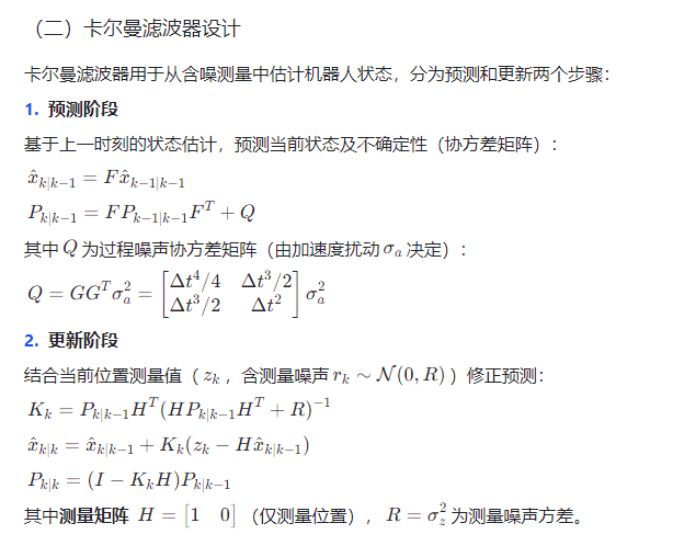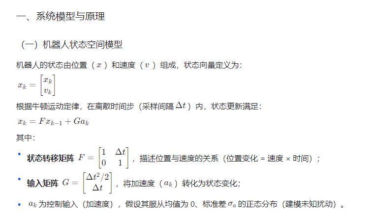 在机器人控制系统中,精确的状态估计与稳定的控制策略是实现高性能运动的核心。本文将详细介绍如何结合线性卡尔曼滤波器(Linear Kalman Filter, LKF)和 PID 控制器,实现机器人在无摩擦直道上的速度控制 —— 通过卡尔曼滤波器从含噪位置测量中估计速度,再利用 PID 控制器生成加速度指令,使机器人稳定跟踪目标速度。