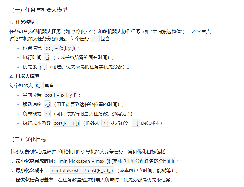 在多机器人系统中,任务分配是实现群体协同的核心环节,其目标是将一系列任务合理分配给各个机器人,使系统整体性能最优(如总任务完成时间最短、能耗最低等)。市场方法(Market-based Approach)作为一种分布式决策机制,通过模拟经济市场中的 “拍卖 - 投标” 过程实现任务分配,具有灵活性高、鲁棒性强、易于扩展等特点,特别适用于动态环境下的多机器人协同场景。本文将系统介绍基于市场方法的多机器人任务分配策略,从问题建模到具体实现展开详细论述。