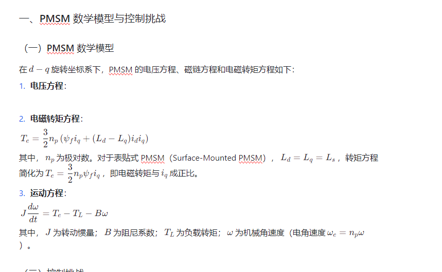 永磁同步电机(Permanent Magnet Synchronous Motor, PMSM)凭借高效率、高功率密度、快速动态响应等优势,被广泛应用于新能源汽车、工业机器人、航空航天等领域。然而,PMSM 运行过程中存在参数摄动(如定子电阻、电感变化)、负载扰动以及外部不确定性,传统 PI 控制器难以在全工况下保持最优性能。自适应状态反馈控制通过实时估计系统参数和状态,动态调整控制律,可显著提升电机在复杂工况下的鲁棒性和控制精度。本文将详细介绍一种适用于 PMSM 的自适应状态反馈速度控制器设计方法,从数学建模到控制器实现展开全面分析。