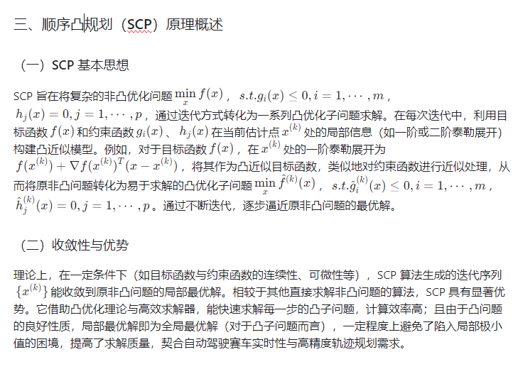 自动驾驶赛车作为探索车辆极限运动控制性能的前沿领域,其轨迹规划的优劣直接决定了赛车能否在赛道上发挥极致速度与稳定性。与常规自动驾驶场景不同,赛车环境下需在极短时间内完成高精度轨迹规划,既要满足严苛的赛道边界、车辆动力学等约束,又要追求圈速最小化的最优目标,传统路径规划算法难以胜任。顺序凸规划(Sequential Convex Programming,SCP)作为一种高效处理非凸优化问题的技术,通过迭代将非凸问题转化为一系列凸优化子问题,为自动驾驶赛车实时最优轨迹规划提供了新的解决方案,能有效平衡计算效率与规划精度,显著提升赛车在复杂赛道条件下的竞技表现。