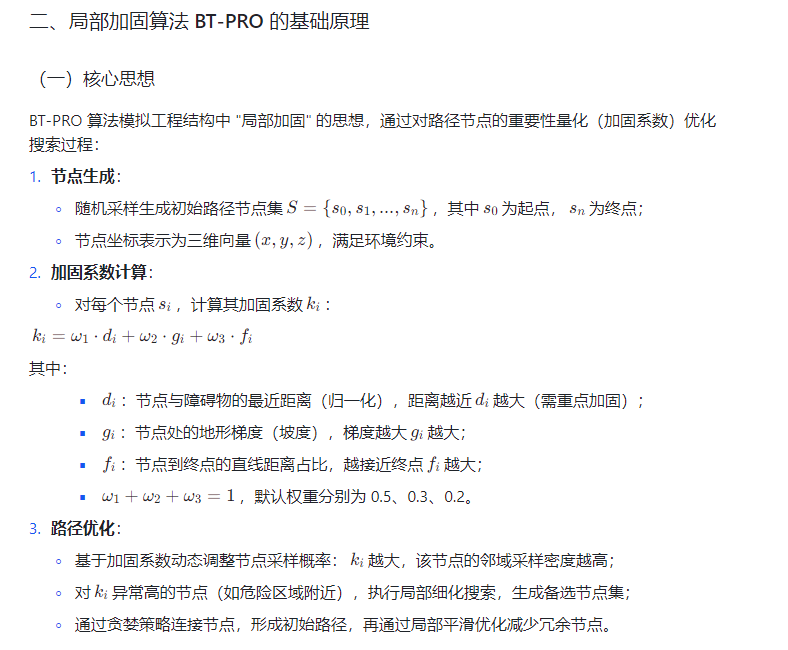 复杂山地环境(如高原峡谷、森林山区)因地形陡峭、障碍物密集、气象条件多变,给无人机路径规划带来极大挑战:传统算法易陷入局部最优(如卡在峡谷死角)、路径安全性不足(与山体距离过近)或平滑性差(频繁变向导致能耗激增)。局部加固算法(BT-PRO)通过动态调整路径节点的 "加固系数" 平衡勘探与开发能力,但在复杂地形中仍存在收敛速度慢、安全距离控制不足的问题。本文提出多策略改进的 BT-PRO 算法,融合地形自适应采样、安全距离动态调整与路径平滑优化策略,实现无人机在复杂山地环境中的高效、安全、低能耗路径规划。