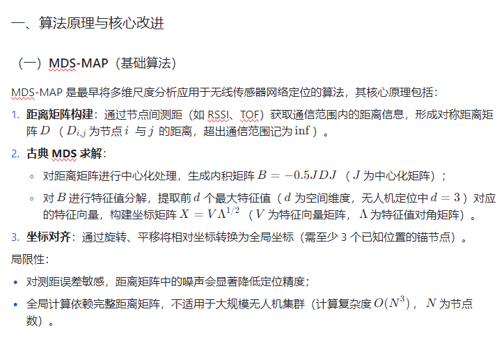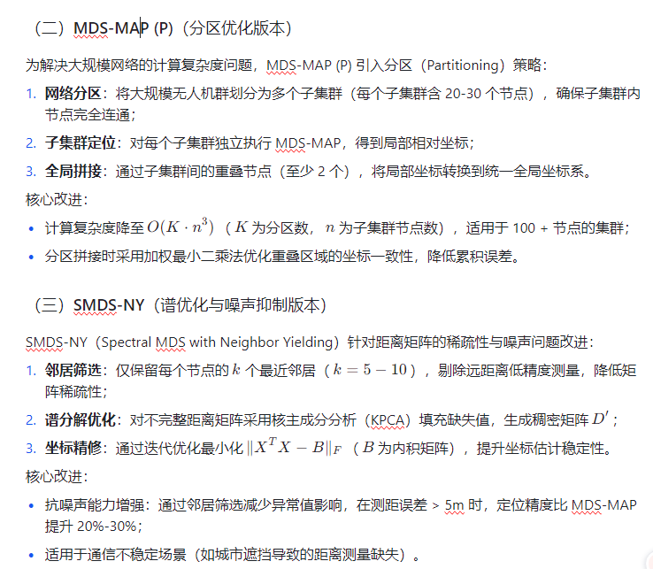 在无人机集群协同定位中,基于多维尺度分析(MDS)的算法因无需依赖全局参考系、适用于分布式部署而被广泛研究。MDS-MAP 及其改进版本(MDS-MAP (P)、SMDS-NY、SMDS (P)-NY-PM)通过优化距离矩阵构建、坐标变换与误差修正机制,逐步提升定位精度与环境适应性。本文从算法原理、定位流程、性能特点三个维度对四种算法进行系统比较,为无人机群在复杂环境(如城市峡谷、山地)中的定位方案选择提供参考。
