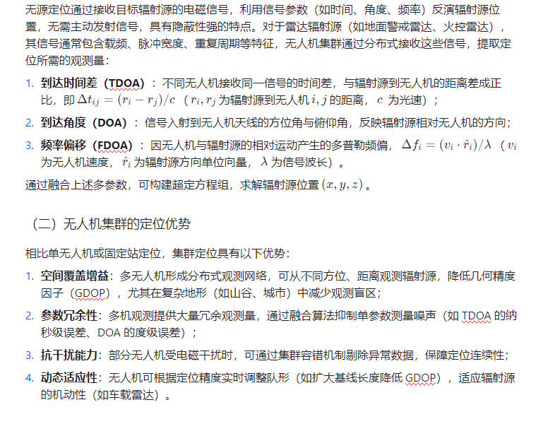 在现代电子战与战场侦察中,对雷达辐射源的高精度无源定位是获取战场电磁态势的核心环节。无人机集群凭借机动性强、部署灵活、覆盖范围广等优势,成为雷达辐射源定位的理想平台。传统单无人机定位依赖单一参数(如到达时间差、到达角度),易受测量噪声、电磁干扰和几何构型限制,难以满足复杂环境下的高精度定位需求。本文提出基于无人机集群的多参数融合定位技术,通过融合到达时间差(TDOA)、到达角度(DOA)、频率差异(FDOA)等多源信息,结合集群协同观测策略,实现对目标区域雷达辐射源的厘米级定位,为战场电磁侦察提供关键技术支撑。