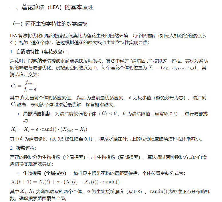 莲花算法(Lotus Flower Algorithm, LFA)是一种受自然启发的新型优化算法,其核心灵感来源于莲花独特的自清洁特性(“莲花效应”)与复杂的授粉过程。在优化问题中,LFA 通过模拟莲花叶片的自清洁机制实现局部搜索与全局探索的动态平衡,同时借助生物与非生物授粉过程的协同作用,构建高效的寻优路径