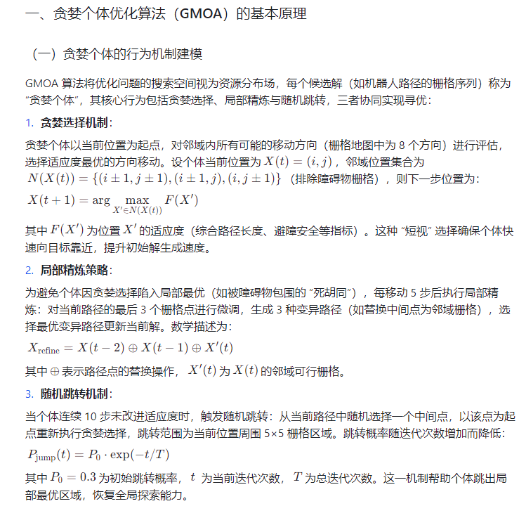 在移动机器人路径规划领域,贪婪策略因能快速生成近似最优解而被广泛应用,但传统贪婪算法易陷入局部最优。贪婪个体优化算法(Greedy Individual Optimization Algorithm, GMOA)通过模拟生物个体在资源搜索中的 “贪婪探索 - 局部微调” 行为,平衡了求解速度与全局寻优能力。该算法以个体为核心,通过贪婪选择机制快速逼近目标,同时引入随机扰动避免搜索停滞,特别适合栅格地图这类离散化环境的路径规划。本文将 GMOA 应用于移动机器人路径规划,构建适应栅格特征的寻优模型,解决复杂障碍场景中的高效路径搜索问题。