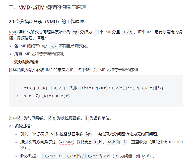 时序数据预测是数据分析领域的核心任务之一,广泛应用于电力负荷预测、交通流量预警、金融走势分析等场景。然而,实际时序数据往往包含多尺度特征(如短期波动、中期趋势、长期周期)和非线性噪声,传统单一模型(如 ARIMA、单一 LSTM)难以同时捕捉复杂特征,导致预测精度受限。变分模态分解(Variational Mode Decomposition, VMD)作为一种自适应信号分解方法,能将原始序列分解为若干平稳子序列,有效降低数据复杂度;长短时记忆网络(LSTM)则擅长处理时间序列的长期依赖关系。本文提出VMD-LSTM 组合模型,通过 VMD 预处理提取数据内在特征,再利用 LSTM 进行多子序列协同预测,最终通过对比实验验证其优于单一模型的预测性能。