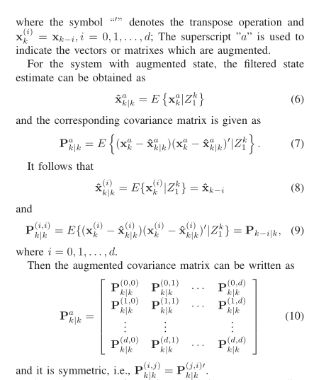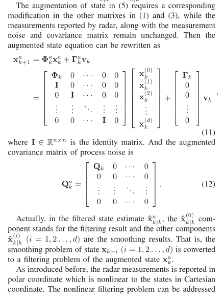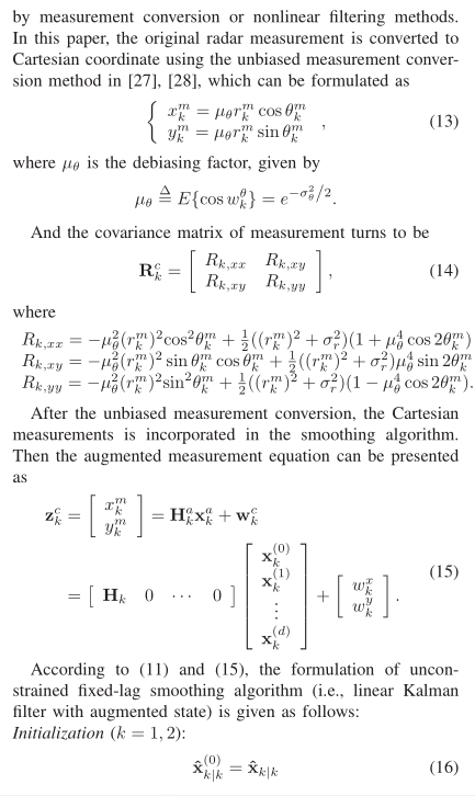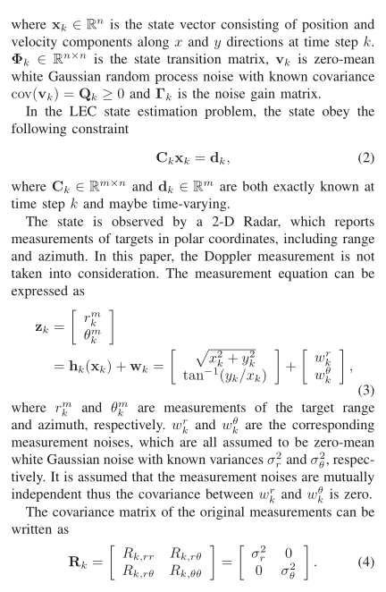 在动态系统状态估计中,固定滞后平滑技术通过利用当前及未来固定长度(滞后L)的观测数据,对过去某时刻的状态进行优化估计,其精度通常高于实时滤波。当系统存在线性等式约束(Linear Equality Constraint, LEC) 时(如目标运动中的速度与位置关系约束、多传感器数据一致性约束),直接应用无约束平滑算法会因忽略先验信息而导致精度损失。本文针对带 LEC 的固定滞后平滑问题,基于状态增广法将多种约束滤波方法(模型简化法、伪测量法、估计投影法等)扩展至平滑场景,通过非线性雷达测量的无偏转换处理,实现线性系统下的约束平滑,并通过蒙特卡洛仿真验证了算法的有效性。