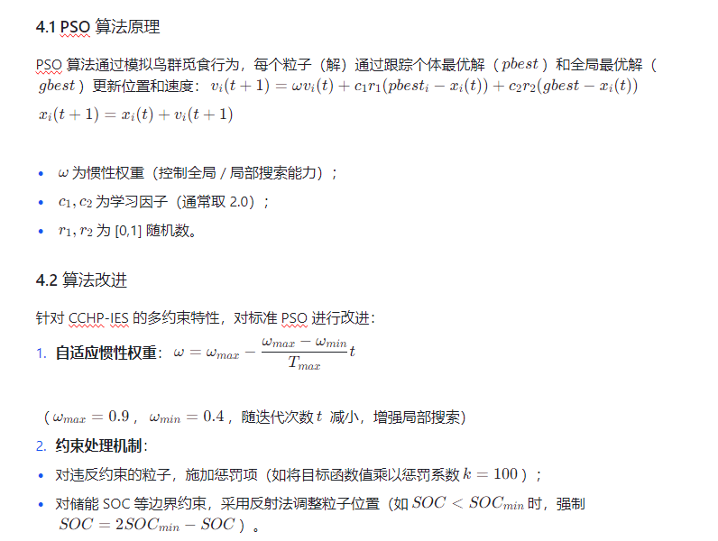 粒子群优化(PSO)算法作为一种群体智能优化方法,具有收敛速度快、参数设置简单、全局寻优能力强等特点,适合解决多变量、多约束的复杂系统优化问题。将 PSO 算法应用于 CCHP-IES 的运行优化,可在满足多能负荷需求的前提下,实现系统运行成本最低、碳排放最少等目标。本文将构建 CCHP-IES 的运行优化模型,设计基于 PSO 的求解策略,并通过仿真验证其有效性。