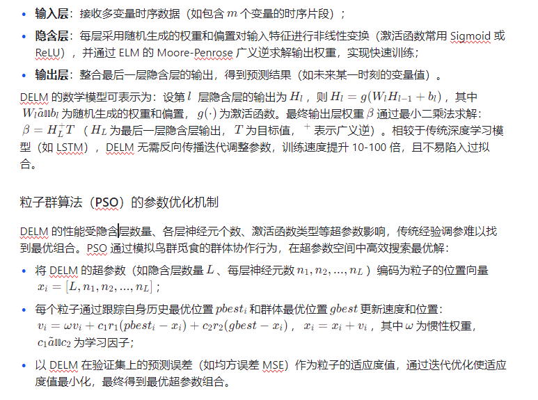 在金融市场分析、工业过程监控、气象预报等领域,多变量时序预测是一项核心任务。这类问题往往涉及多个相互关联的时序变量(如股票价格与成交量、温度与湿度、设备振动与压力等),且变量间存在复杂的非线性依赖关系。深度极限学习机(DELM)凭借其深层结构的特征提取能力和快速训练优势,为多变量时序预测提供了高效工具;而粒子群算法(PSO)通过全局寻优能力优化 DELM 的关键参数,可进一步提升模型的预测精度和稳定性。二者结合形成的 PSO-DELM 模型,能有效捕捉多变量时序数据中的动态关联,为复杂场景的时序预测提供可靠解决方案。