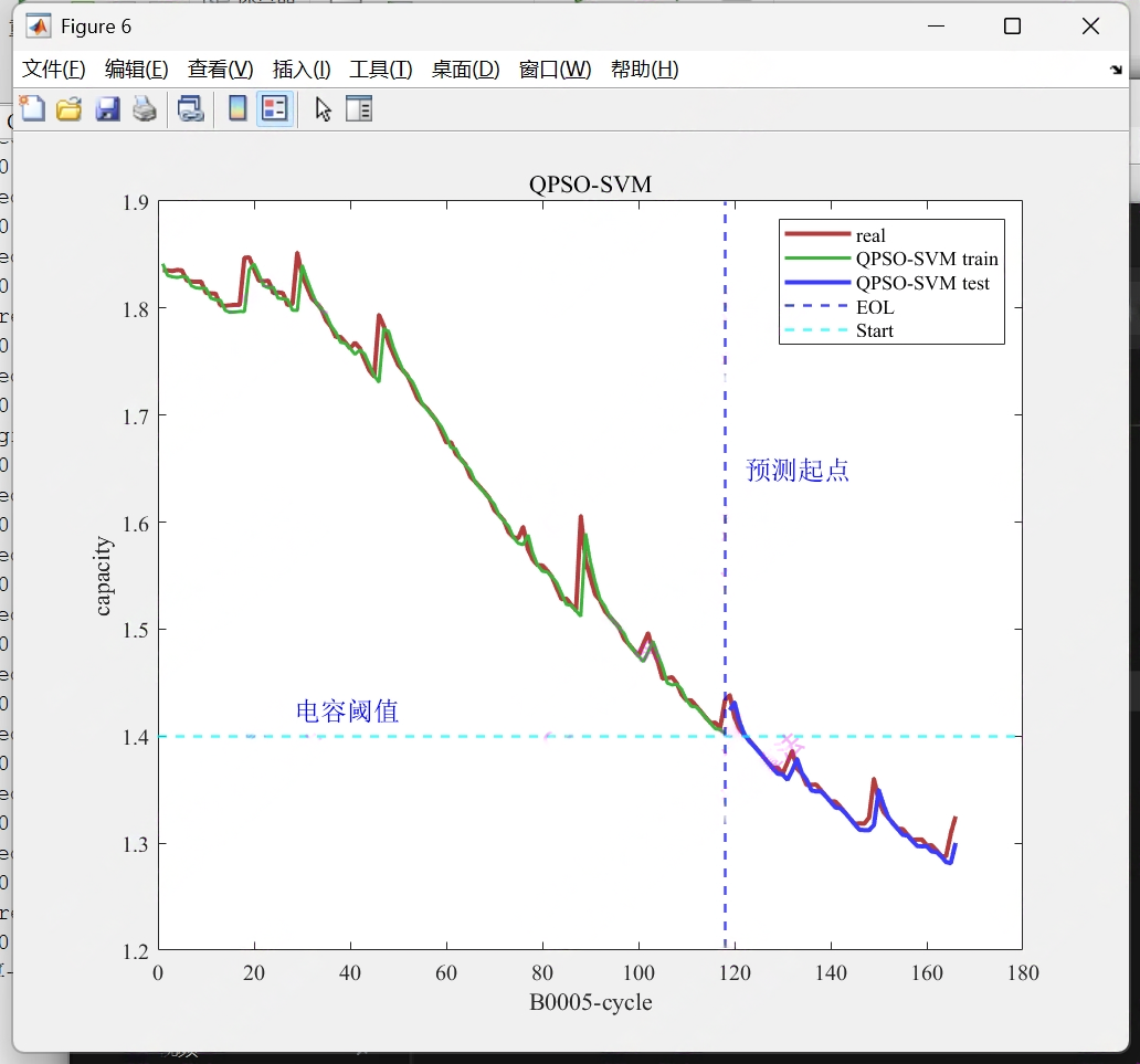 锂电池剩余寿命(RUL)预测是新能源领域保障设备可靠性的核心技术之一,而电池容量作为寿命退化的直接表征,其精准提取与建模是预测的关键。支持向量回归(SVR)在处理小样本、非线性问题时具有天然优势,但参数选择对其性能影响显著;量子粒子群优化(QPSO)算法通过模拟量子行为提升了全局寻优能力,可有效优化 SVR 参数。将 QPSO 与 SVR 结合(QPSO-SVR),并融入电池容量提取技术,能构建兼具鲁棒性与精度的锂电池剩余寿命预测模型,为工程实践提供可靠的寿命评估工具。