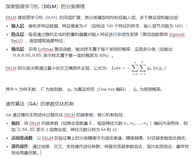 - GA 的参数优化能力:DELM 的分类性能受隐含层数量、神经元个数等超参数影响显著,GA 可在超参数空间中全局搜索最优组合,避免经验调参的局限性;