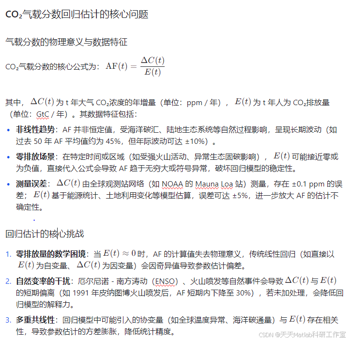 CO₂气载分数(Airborne Fraction, AF)是衡量人类活动排放的 CO₂在大气中留存比例的关键指标,其计算公式为大气 CO₂浓度年增量与人为 CO₂排放量的比值。准确估计 AF 对于理解碳循环反馈机制、评估气候政策效果具有重要意义。然而,AF 的回归估计面临两大挑战:一是零排放量场景(如自然源与人为源抵消时)的数据处理,二是统计精度的提升(受测量误差、自然变率等因素影响)。本文围绕 CO₂气载分数的回归估计器设计,系统阐述零排放量处理策略、统计精度优化方法及模型构建流程。
