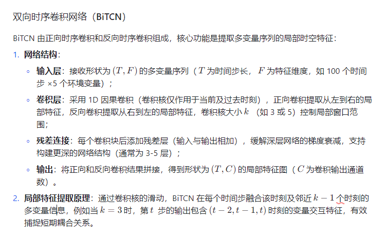 - BiTCN 的局部特征提取:双向时序卷积能捕捉变量在局部时间窗口内的交互模式(如未来 24 小时的气温与前 6 小时的湿度变化关联),通过因果卷积避免信息泄露,适合处理多变量的短期动态;