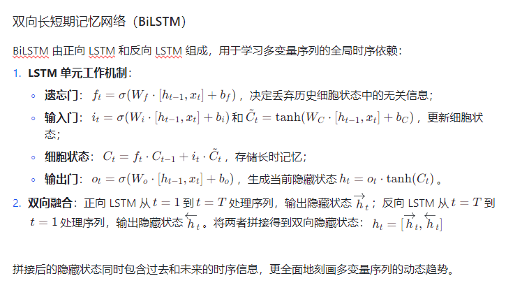 - BiLSTM 的全局时序建模:双向 LSTM 从正向和反向两个方向学习长时序依赖,有效捕捉多变量序列的长期趋势(如年度降水模式对农作物产量的影响),缓解梯度消失问题;