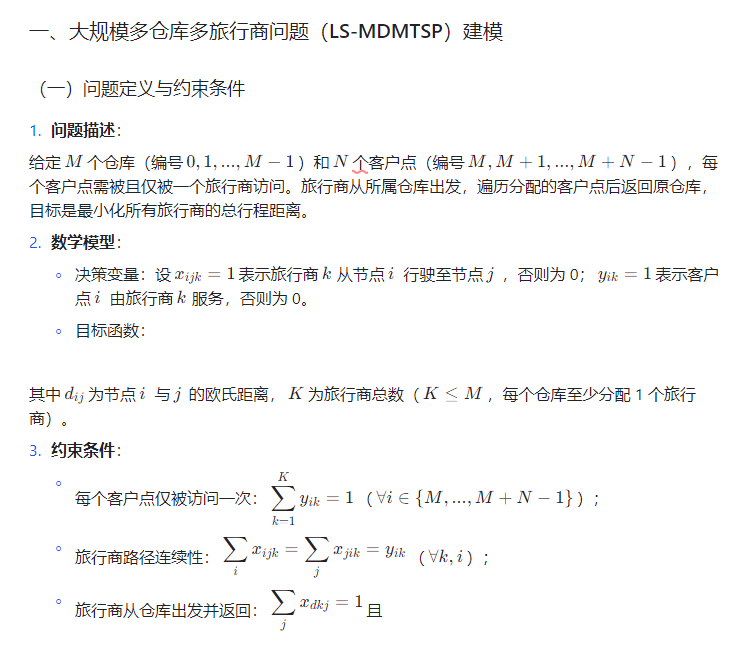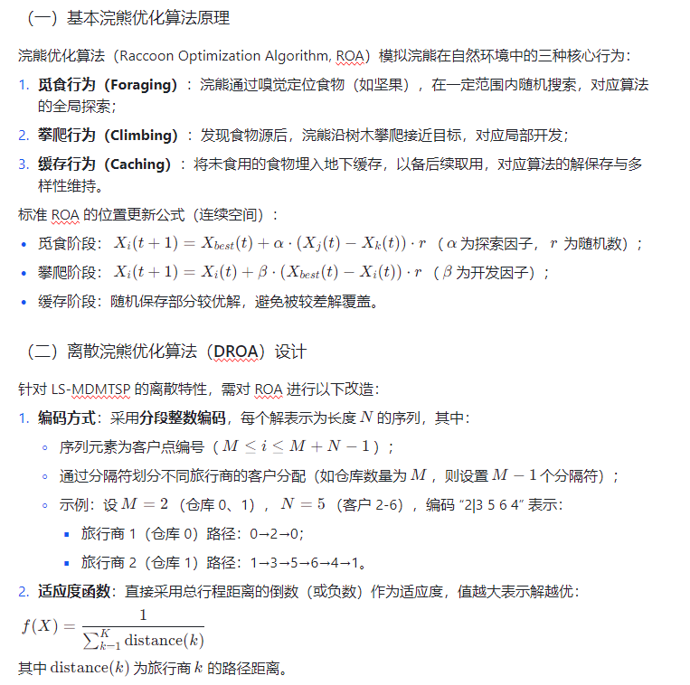 大规模多仓库多旅行商问题(Large-Scale Multi-Depot Multi-Traveling Salesman Problem, LS-MDMTSP)是组合优化领域的典型 NP-hard 问题,广泛存在于物流配送、智能仓储、无人机集群调度等实际场景中。其核心目标是为多个旅行商(如配送车辆、无人机)从不同仓库出发,规划最优路径以覆盖所有客户点,同时最小化总行程距离或时间。由于客户规模庞大(通常达数百至数千个)且存在多仓库约束,传统精确算法难以在合理时间内求解,而启发式算法成为主流方案。离散浣熊优化算法(Discrete Raccoon Optimization Algorithm, DROA) 借鉴浣熊的觅食、攀爬、缓存等行为机制,通过离散化处理适配组合优化问题,在求解大规模组合优化问题时展现出良好的全局搜索能力与收敛效率。本文将构建基于 DROA 的 LS-MDMTSP 求解框架,设计针对问题特性的编码方式与寻优策略,通过实验验证算法在大规模场景下的性能优势。